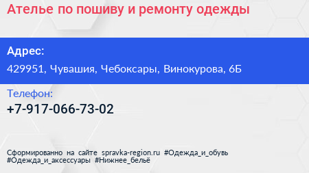 Ателье по пошиву и ремонту одежды по адресу 429951, Чувашия, Чебоксары, Винокурова, 6Б в дальнейшем Организация, размещена в следующих категориях: