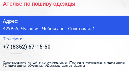 Ателье по пошиву одежды по адресу 429955, Чувашия, Чебоксары, Советская, 1 в дальнейшем Организация, размещена в следующих категориях: