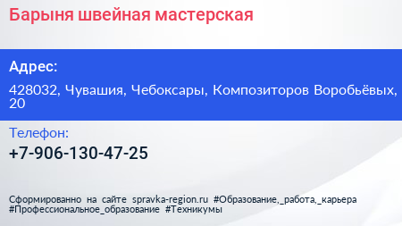 Барыня, швейная мастерская по адресу 428032, Чувашия, Чебоксары, Композиторов Воробьёвых, 20 в дальнейшем Организация, размещена в следующих категориях: