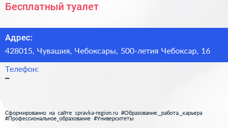 Бесплатный туалет по адресу 428015, Чувашия, Чебоксары, 500-летия Чебоксар, 16 в дальнейшем Организация, размещена в следующих категориях: