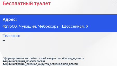 Бесплатный туалет по адресу 429500, Чувашия, Чебоксары, Шоссейная, 9 в дальнейшем Организация, размещена в следующих категориях: