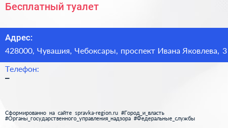 Бесплатный туалет по адресу 428000, Чувашия, Чебоксары, проспект Ивана Яковлева, 3 в дальнейшем Организация, размещена в следующих категориях: