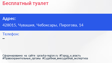 Бесплатный туалет по адресу 428015, Чувашия, Чебоксары, Пирогова, 14 в дальнейшем Организация, размещена в следующих категориях: