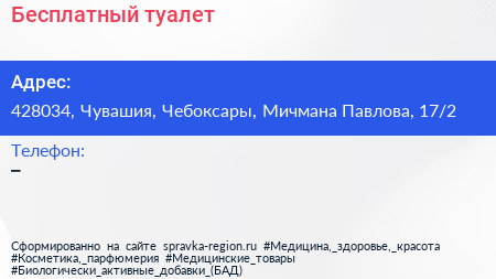 Бесплатный туалет по адресу 428034, Чувашия, Чебоксары, Мичмана Павлова, 17/2 в дальнейшем Организация, размещена в следующих категориях:
