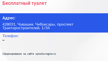 Бесплатный туалет по адресу 428031, Чувашия, Чебоксары, проспект Тракторостроителей, 1/34 в дальнейшем Организация, размещена в следующих категориях: