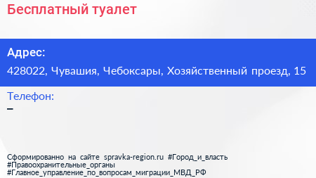 Бесплатный туалет по адресу 428022, Чувашия, Чебоксары, Хозяйственный проезд, 15 в дальнейшем Организация, размещена в следующих категориях: