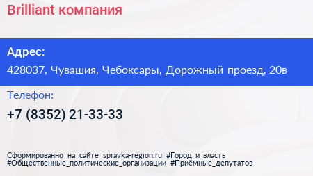 Brilliant, компания по адресу 428037, Чувашия, Чебоксары, Дорожный проезд, 20в в дальнейшем Организация, размещена в следующих категориях: