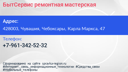 БытСервис, ремонтная мастерская по адресу 428003, Чувашия, Чебоксары, Карла Маркса, 47 в дальнейшем Организация, размещена в следующих категориях: