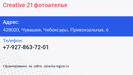 Creative 21, фотоателье по адресу 428020, Чувашия, Чебоксары, Привокзальная, 6 в дальнейшем Организация, размещена в следующих категориях: