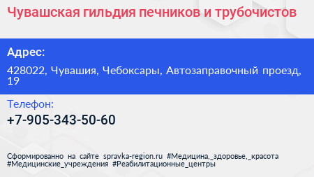 Чувашская гильдия печников и трубочистов по адресу 428022, Чувашия, Чебоксары, Автозаправочный проезд, 19 в дальнейшем Организация, размещена в следующих категориях: