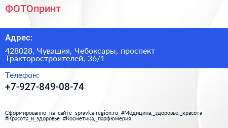 ФОТОпринт по адресу 428028, Чувашия, Чебоксары, проспект Тракторостроителей, 36/1 в дальнейшем Организация, размещена в следующих категориях: