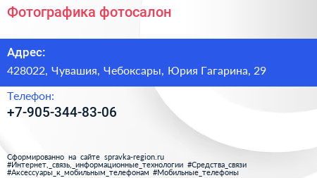 Фотографика, фотосалон по адресу 428022, Чувашия, Чебоксары, Юрия Гагарина, 29 в дальнейшем Организация, размещена в следующих категориях: