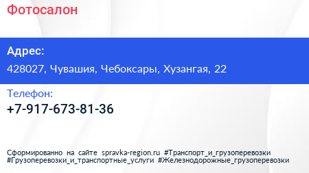Фотосалон по адресу 428027, Чувашия, Чебоксары, Хузангая, 22 в дальнейшем Организация, размещена в следующих категориях: