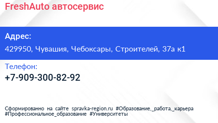 FreshАuto, автосервис по адресу 429950, Чувашия, Чебоксары, Строителей, 37а к1 в дальнейшем Организация, размещена в следующих категориях: