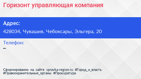 Горизонт, управляющая компания по адресу 428034, Чувашия, Чебоксары, Эльгера, 20 в дальнейшем Организация, размещена в следующих категориях: