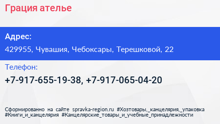 Грация, ателье по адресу 429955, Чувашия, Чебоксары, Терешковой, 22 в дальнейшем Организация, размещена в следующих категориях: