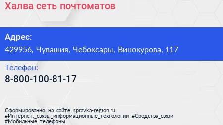 Халва, сеть почтоматов по адресу 429956, Чувашия, Чебоксары, Винокурова, 117 в дальнейшем Организация, размещена в следующих категориях: