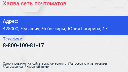 Халва, сеть почтоматов по адресу 428000, Чувашия, Чебоксары, Юрия Гагарина, 17 в дальнейшем Организация, размещена в следующих категориях: