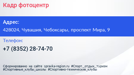 Кадр, фотоцентр по адресу 428024, Чувашия, Чебоксары, проспект Мира, 9 в дальнейшем Организация, размещена в следующих категориях: