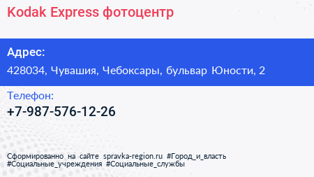 Kodak Express, фотоцентр по адресу 428034, Чувашия, Чебоксары, бульвар Юности, 2 в дальнейшем Организация, размещена в следующих категориях: