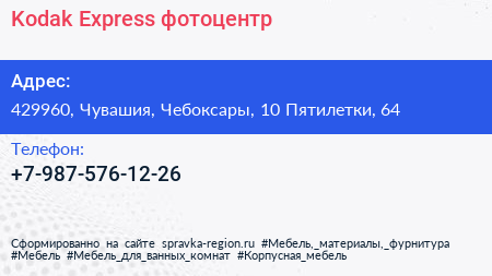 Kodak Express, фотоцентр по адресу 429960, Чувашия, Чебоксары, 10 Пятилетки, 64 в дальнейшем Организация, размещена в следующих категориях:
