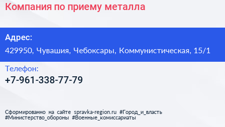Компания по приему металла по адресу 429950, Чувашия, Чебоксары, Коммунистическая, 15/1 в дальнейшем Организация, размещена в следующих категориях: