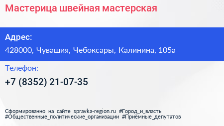 Мастерица, швейная мастерская по адресу 428000, Чувашия, Чебоксары, Калинина, 105а в дальнейшем Организация, размещена в следующих категориях: