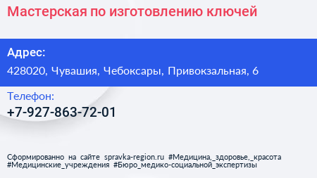 Мастерская по изготовлению ключей по адресу 428020, Чувашия, Чебоксары, Привокзальная, 6 в дальнейшем Организация, размещена в следующих категориях: