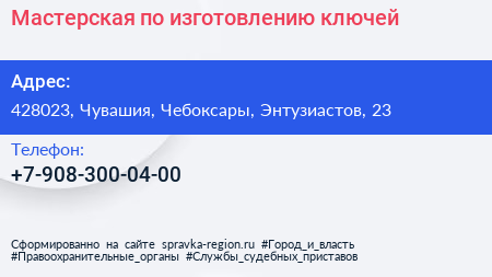 Мастерская по изготовлению ключей по адресу 428023, Чувашия, Чебоксары, Энтузиастов, 23 в дальнейшем Организация, размещена в следующих категориях: