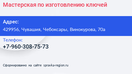 Мастерская по изготовлению ключей по адресу 429956, Чувашия, Чебоксары, Винокурова, 70а в дальнейшем Организация, размещена в следующих категориях: