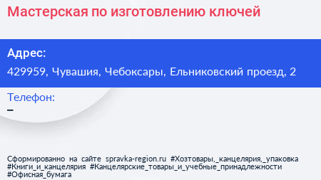 Мастерская по изготовлению ключей по адресу 429959, Чувашия, Чебоксары, Ельниковский проезд, 2 в дальнейшем Организация, размещена в следующих категориях: