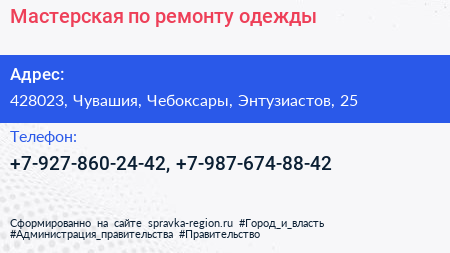 Мастерская по ремонту одежды по адресу 428023, Чувашия, Чебоксары, Энтузиастов, 25 в дальнейшем Организация, размещена в следующих категориях: