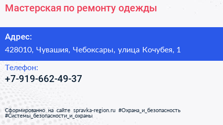 Мастерская по ремонту одежды по адресу 428010, Чувашия, Чебоксары, улица Кочубея, 1 в дальнейшем Организация, размещена в следующих категориях: