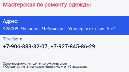 Мастерская по ремонту одежды по адресу 428009, Чувашия, Чебоксары, Университетская, 9 к1 в дальнейшем Организация, размещена в следующих категориях: