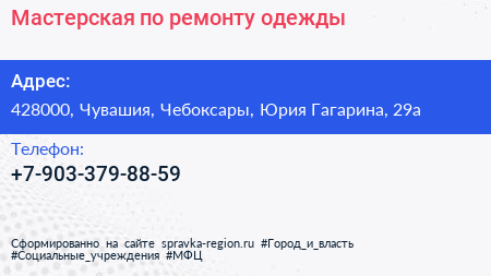 Мастерская по ремонту одежды по адресу 428000, Чувашия, Чебоксары, Юрия Гагарина, 29а в дальнейшем Организация, размещена в следующих категориях:
