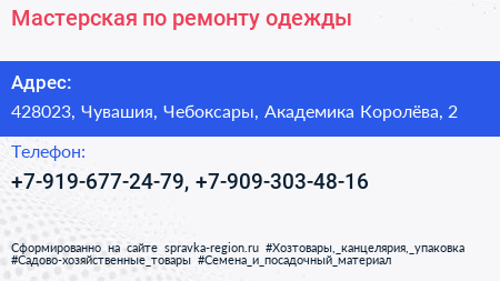 Мастерская по ремонту одежды по адресу 428023, Чувашия, Чебоксары, Академика Королёва, 2 в дальнейшем Организация, размещена в следующих категориях: