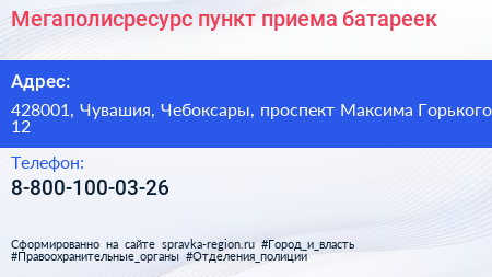 Мегаполисресурс, пункт приема батареек по адресу 428001, Чувашия, Чебоксары, проспект Максима Горького, 12 в дальнейшем Организация, размещена в следующих категориях: