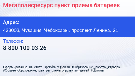 Мегаполисресурс, пункт приема батареек по адресу 428003, Чувашия, Чебоксары, проспект Ленина, 21 в дальнейшем Организация, размещена в следующих категориях: