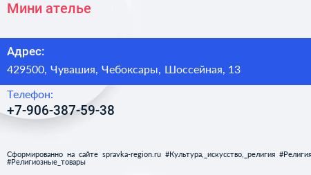 Мини-ателье по адресу 429500, Чувашия, Чебоксары, Шоссейная, 13 в дальнейшем Организация, размещена в следующих категориях: