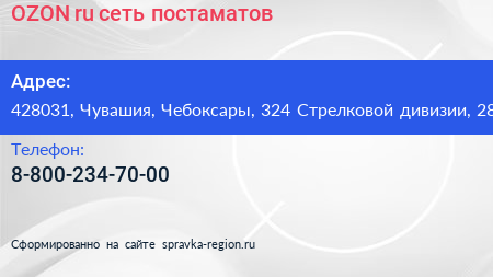 OZON.ru, сеть постаматов по адресу 428031, Чувашия, Чебоксары, 324 Стрелковой дивизии, 28 в дальнейшем Организация, размещена в следующих категориях: