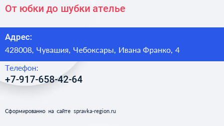 От юбки до шубки, ателье по адресу 428008, Чувашия, Чебоксары, Ивана Франко, 4 в дальнейшем Организация, размещена в следующих категориях:
