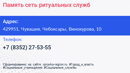 Память, сеть ритуальных служб по адресу 429951, Чувашия, Чебоксары, Винокурова, 10 в дальнейшем Организация, размещена в следующих категориях: