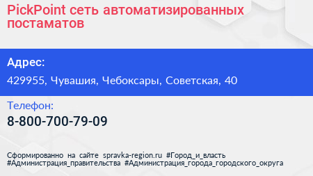 PickPoint, сеть автоматизированных постаматов по адресу 429955, Чувашия, Чебоксары, Советская, 40 в дальнейшем Организация, размещена в следующих категориях: