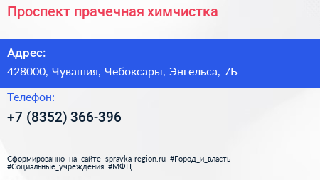 Проспект, прачечная-химчистка по адресу 428000, Чувашия, Чебоксары, Энгельса, 7Б в дальнейшем Организация, размещена в следующих категориях: