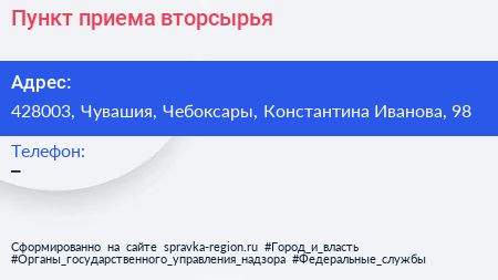 Пункт приема вторсырья по адресу 428003, Чувашия, Чебоксары, Константина Иванова, 98 в дальнейшем Организация, размещена в следующих категориях: