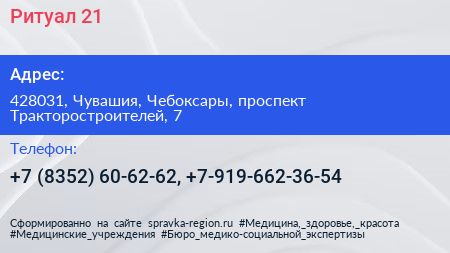 Ритуал 21 по адресу 428031, Чувашия, Чебоксары, проспект Тракторостроителей, 7 в дальнейшем Организация, размещена в следующих категориях: