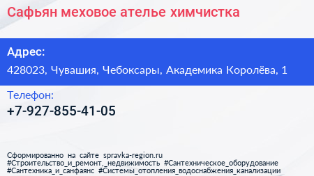 Сафьян, меховое ателье-химчистка по адресу 428023, Чувашия, Чебоксары, Академика Королёва, 1 в дальнейшем Организация, размещена в следующих категориях: