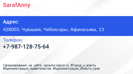 SarafAnny по адресу 428003, Чувашия, Чебоксары, Афанасьева, 13 в дальнейшем Организация, размещена в следующих категориях: