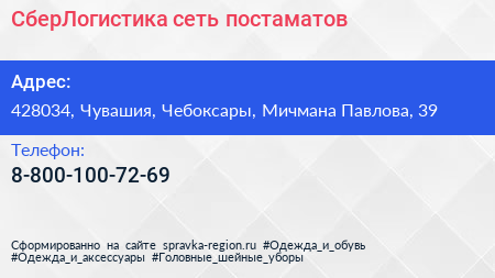 СберЛогистика, сеть постаматов по адресу 428034, Чувашия, Чебоксары, Мичмана Павлова, 39 в дальнейшем Организация, размещена в следующих категориях: