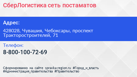 СберЛогистика, сеть постаматов по адресу 428028, Чувашия, Чебоксары, проспект Тракторостроителей, 71 в дальнейшем Организация, размещена в следующих категориях: